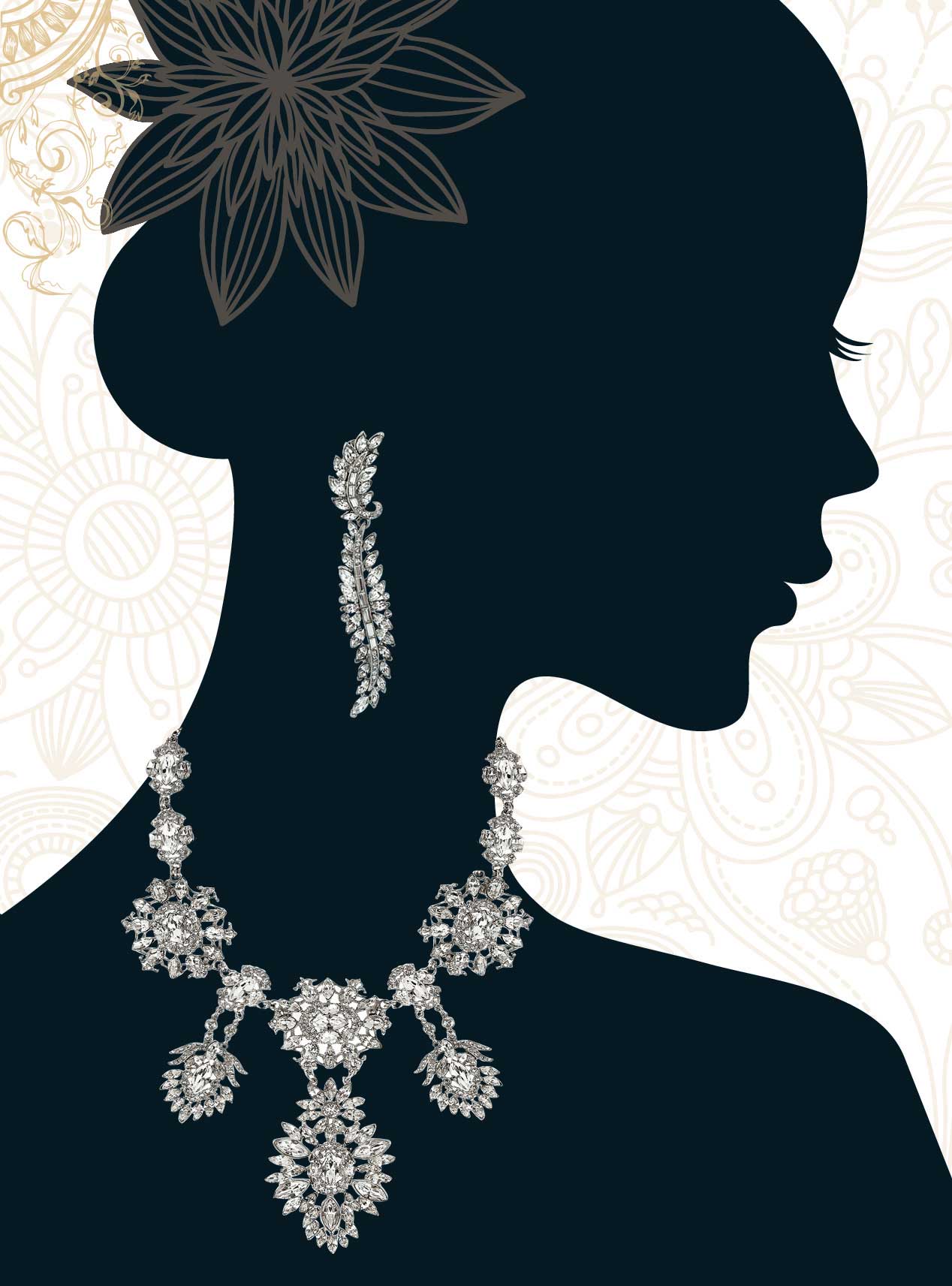 The necklace sits low on your décolletage, and it sparkles elegantly with a dress that has a plunging neckline or a high collared blouse. Encrusted with Swarovski crystals, let it shine on and keep your neck in focus with swept-back hair.The earrings are an intrinsic combination of baguette, marquise and round Swarovski crystals. It has a feather-like shape but it’s not light.